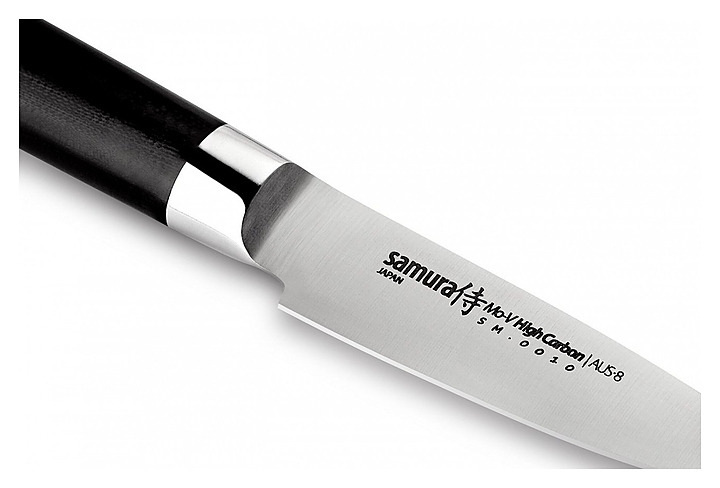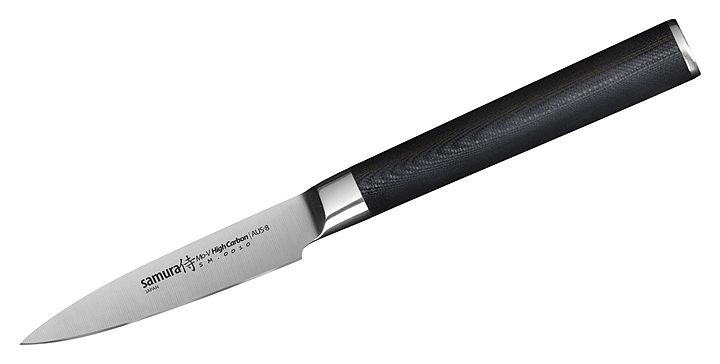 Японский кухонный нож Samura Mo-V SM-0010/K предназначен для чистки и нарезки овощей и фруктов на предприятиях общественного питания и торговли, в частных домах и квартирах. Небольшой клинок имеет тонкое острие и очень небольшой вес. Лезвие выполнено из коррозионно-стойкой однослойной стали AUS-8, ручка - из стеклоткани G-10. Особенности: