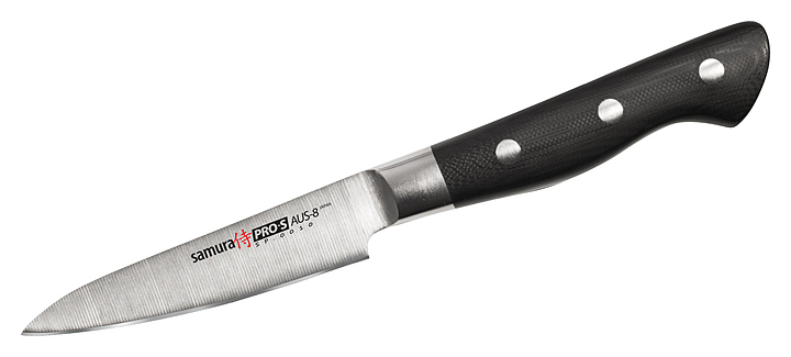 Японский кухонный нож Samura Pro-S SP-0010/K предназначен для чистки и нарезки овощей и фруктов на предприятиях общественного питания и торговли, в частных домах и квартирах. Безупречная острота режущей кромки и анатомически выверенная рукоять делают нож надёжным и эффективным помощником на кухне. Лезвие выполнено из коррозионно-стойкой однослойной стали AUS-8, ручка - из стеклоткани G-10. Особенности: