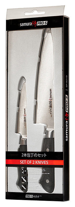 Набор японских кухонных ножей Samura Pro-S SP-0210/K предназначен для нарезки различных продуктов на предприятиях общественного питания и торговли, в частных домах и квартирах. Безупречная острота режущей кромки и анатомически выверенные рукояти делают ножи надёжными и эффективными помощниками на кухне. Лезвия выполнены из коррозионно-стойкой однослойной стали AUS-8, ручки - из стеклоткани G-10. В комплект поставки входят нож для шефа и универсальный нож. Особенности: