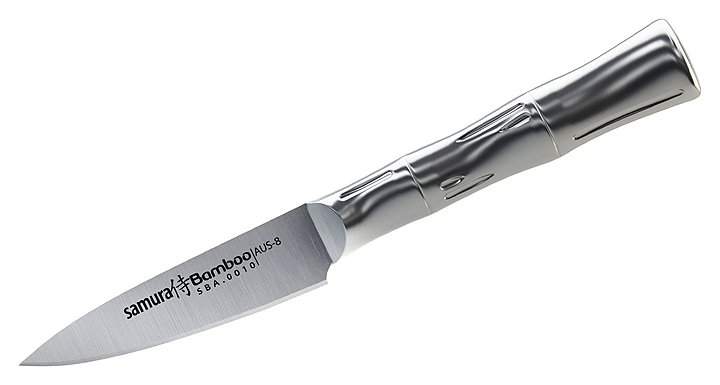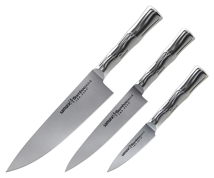 Набор кухонных ножей Samura Bamboo SBA-0220/K предназначен для нарезки различных продуктов на предприятиях общественного питания и торговли, в частных домах и квартирах. Рукояти сделаны в виде бамбукового стебля, без швов. Лезвия и ручки выполнены из коррозионно-стойкой молибдено-ванадиевой однослойной стали AUS-8. В комплект поставки входят нож для шефа, универсальный нож и овощной нож. Особенности: