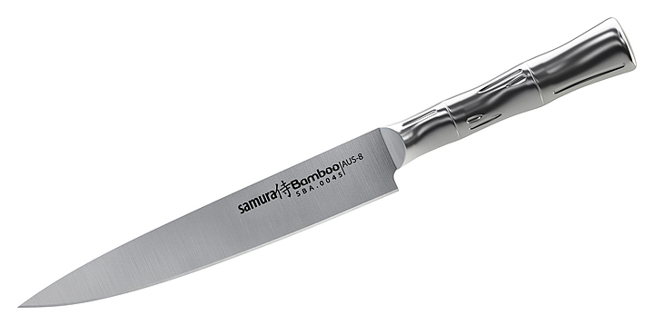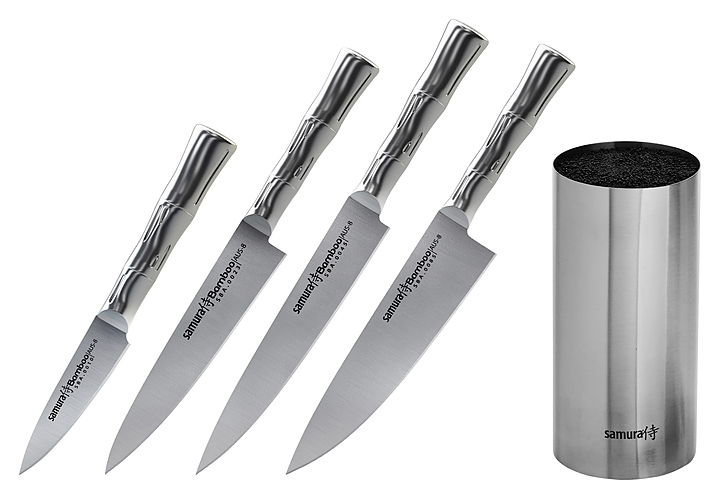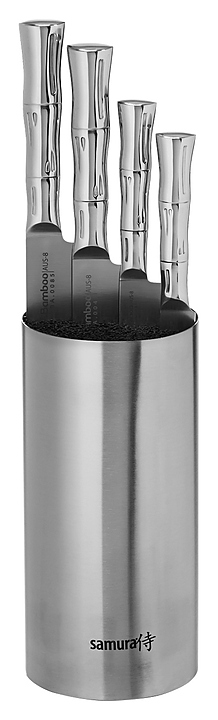 Набор кухонных ножей Samura Bamboo SBA-05/K предназначен для нарезки различных продуктов на предприятиях общественного питания и торговли, в частных домах и квартирах. Рукояти сделаны в виде бамбукового стебля, без швов. Лезвия и ручки выполнены из коррозионно-стойкой молибдено-ванадиевой однослойной стали AUS-8. В комплект поставки входят нож для шефа, универсальный нож, нож для нарезки, овощной нож и металлическая браш-подставка. Особенности: