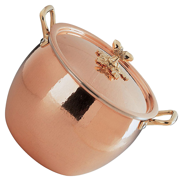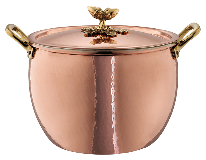 Кастрюля Ruffoni 3102-20B используется на предприятиях общественного питания для приготовления широкого спектра блюд. Модель оснащена изготовленными вручную фиксированными ручками и плотно закрывающейся крышкой, позволяющей сохранить тепло внутри кастрюли. Кастрюля подходит для использования со всеми видами плит, кроме индукционных. Изделие выполнено из листовой меди, обеспечивающей максимальную теплопроводность и контроль температуры, декорированные ручки - из бронзы, внутренняя поверхность покрыта нереакционноспособным лужным оловом. Особенности: