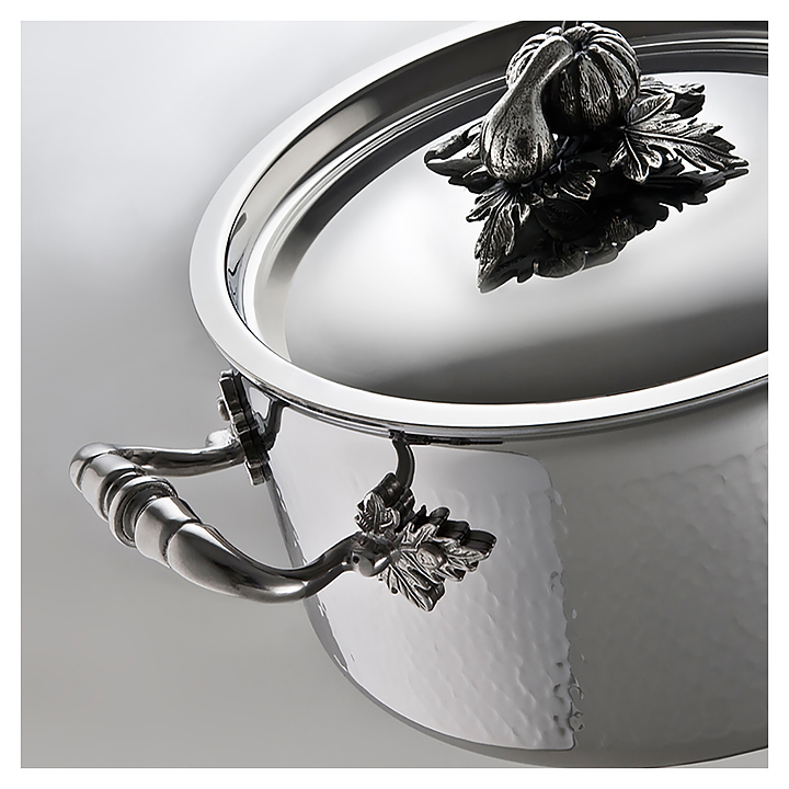Кастрюля Ruffoni G20 используется на предприятиях общественного питания для приготовления широкого спектра блюд. Модель оснащена жаропрочными ручками и крышкой с декорированной ручкой. Кастрюля подходит для использования со всеми видами поверхностей, кроме духовки. Изделие выполнено из 5-слойного металла, состоящего из чередующихся слоев нержавеющей стали и алюминия, ручка на крышке - из посеребренной латуни, боковые ручки, заклепки и винты - из нержавеющей стали. Особенности: