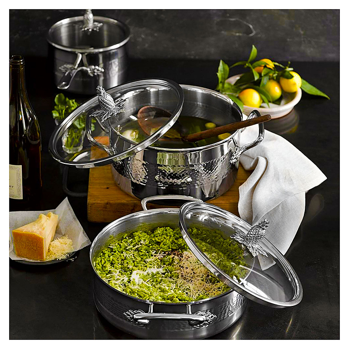Сотейник Ruffoni VPA1811Z используется на предприятиях общественного питания для приготовления широкого спектра блюд. Модель оснащена фиксированной длинной ручкой с растительным декором и крышкой с ручкой в форме ананаса. Сотейник подходит для использования со всеми видами поверхностей. Изделие выполнено из многослойного металла, состоящего из чередующихся слоев нержавеющей стали и алюминия, крышка - из стекла, боковые ручки, заклепки и винты - из нержавеющей стали. Особенности: