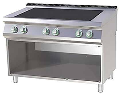 Электрическая плита Azimut SPL 7120 E серии 700 предназначена для приготовления первых, вторых, третьих блюд в наплитной посуде на предприятиях общественного питания и торговли. Модель оснащена сплошной поверхностью с 6 плоскими квадратными конфорками. Каждая конфорка имеет независимый 6-позиционный терморегулятор и внутреннюю термическую защиту от перегрева: если конфорка пуста, её нагрев уменьшится автоматически. Корпус и ножки выполнены из нержавеющей стали AISI 304. Дополнительные характеристики: