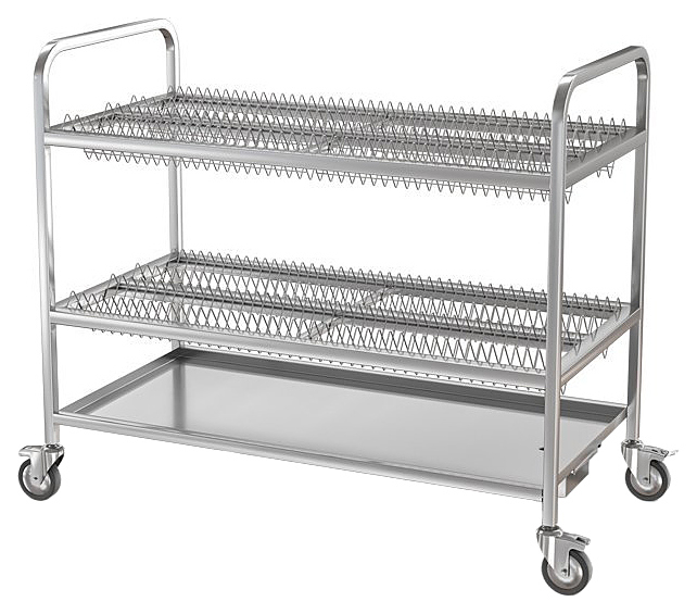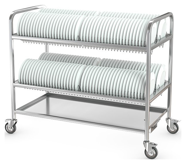 Тележка ATESY ТТ-Л-2-1200.600-02 серии Люкс используется на предприятиях общественного питания и торговли для временного хранения, транспортировки и естественной сушки тарелок, блюдец и другой посуды. Модель оснащена съемными кассетами для сушки тарелок. Полки и поддон выполнены из нержавеющей стали AISI 304, кассеты - из нержавеющего прутка AISI 304, рамы - из нержавеющей трубы AISI 304 сечением 25х25 мм. Особенности: