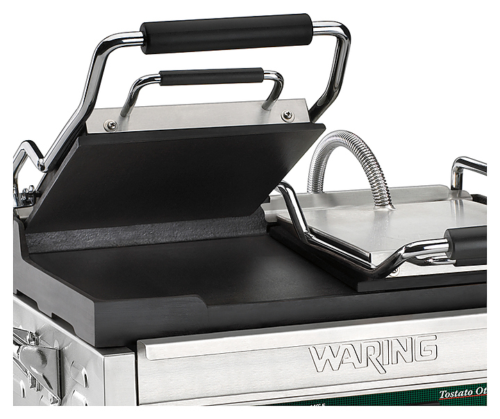 Прижимной гриль Waring WFG300 предназначен для приготовления стейков, гамбургеров и горячих сэндвичей, а также для жарки мяса, птицы, рыбы и овощей на предприятиях общественного питания, торговли и в домашних условиях. Модель оснащена 2 регулируемыми термостатами и съемным лотком для сбора жира, масла и остатков пищи. Корпус выполнен из матовой нержавеющей стали. Особенности:
