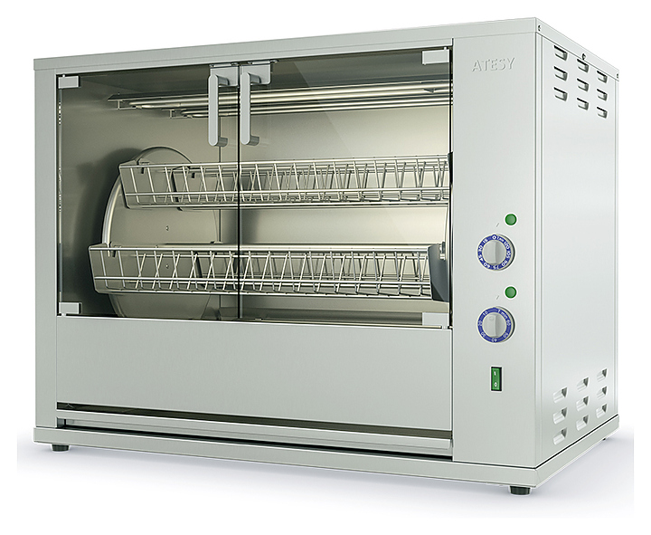 Гриль для кур ATESY Командор-6Э-Т-380 используется на предприятиях общественного питания и торговли для жарки тушек кур, цыплят, куриных окорочков, грудок и других продуктов питания. Модель оснащена 6 легкосъемными садками (люльками), вращающимися вокруг центральной оси внутри рабочей камеры. Корпус выполнен из пищевой нержавеющей стали AISI 430, садки для кур - из нержавеющего прутка, двери - из закаленного термостойкого ударопрочного стекла. Особенности: