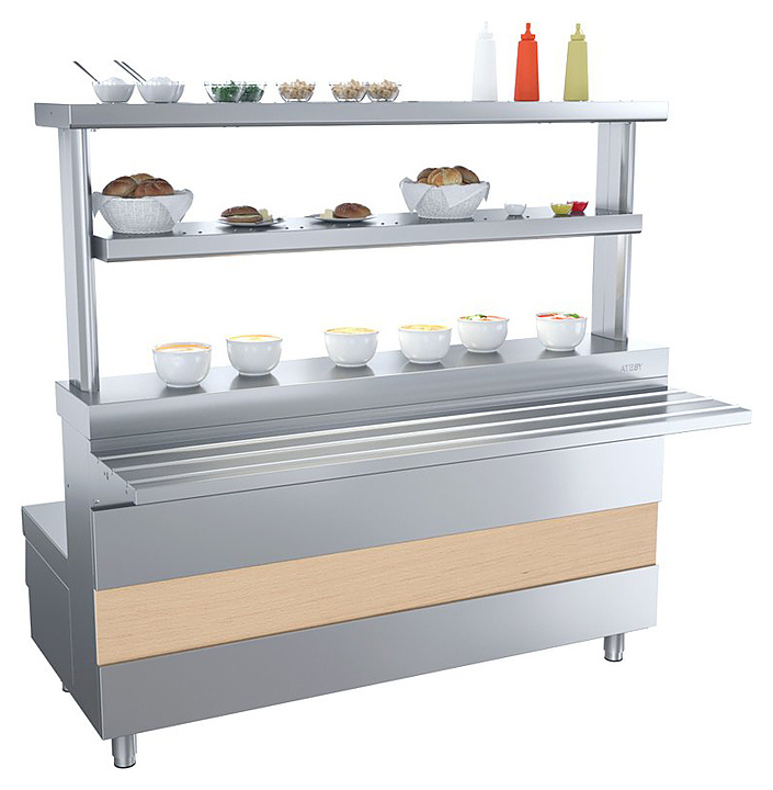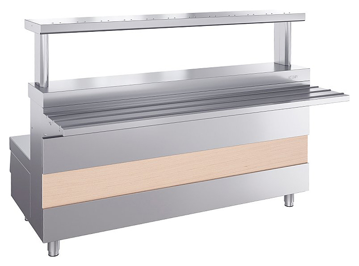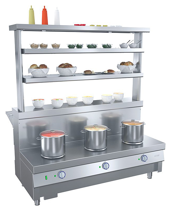Мармит ATESY Ривьера М1-3.1500-02-О используется в составе линии раздачи Ривьера на предприятиях общественного питания и торговли для поддержания в горячем состоянии наплитной посуды с первыми блюдами. Модель оснащена 3 круглыми конфорками и 3 6-позиционными пакетными переключателями, позволяющими регулировать их температуру. Столешница выполнена из нержавеющей стали AISI 430 и усилена листом ламинированной ДСП толщиной 16 мм, ножки - из нержавеющей стали и пластиковой опорной части. В комплект поставки входят направляющая для подносов и съемная декоративная панель цвета и текстуры D2413 Дуб. Особенности: