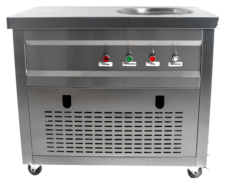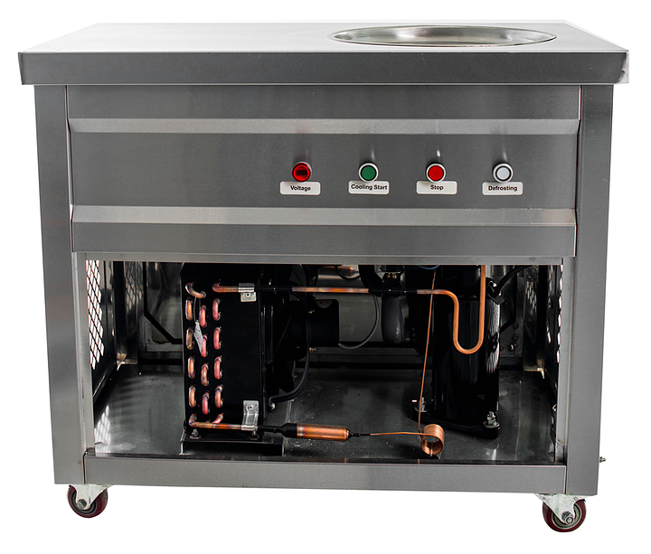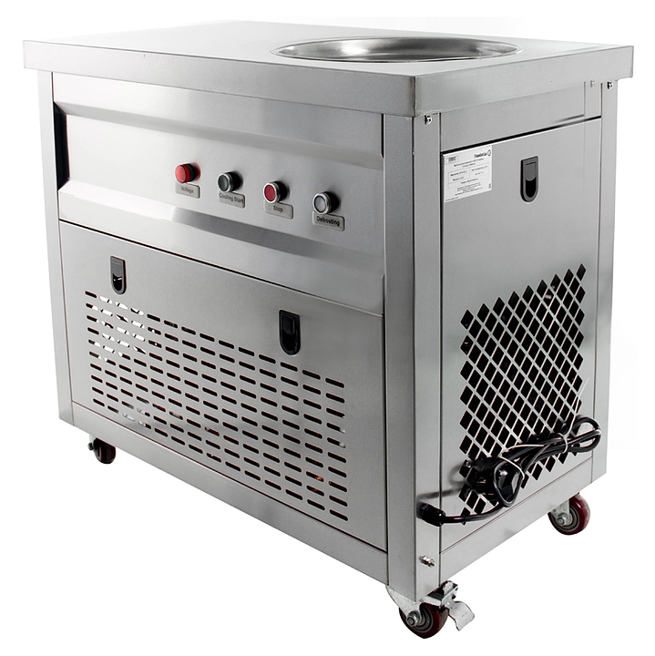 Фризер для мороженого Foodatlas KCB-1Y используется на предприятиях общественного питания и торговли для приготовления жареного мороженого в роллах. Модель оснащена механическим управлением, столом для топпиногов, круглой охлаждаемой поверхностью для "жарки" десерта при минусовой температуре и 4 колесами, 2 из которых снабжены тормозом. Корпус выполнен из нержавеющей стали 430, сковорода - из нержавеющей стали 304, радиатор - из алюминия. Особенности:
