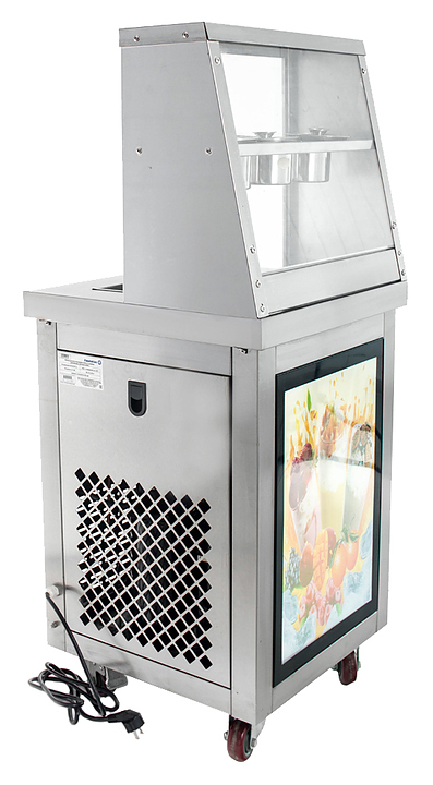 Фризер для мороженого Foodatlas KCB-1Y используется на предприятиях общественного питания и торговли для приготовления жареного мороженого в роллах. Модель оснащена механическим управлением, 3 цилиндрическими контейнерами, световым коробом, круглой охлаждаемой поверхностью для "жарки" десерта при минусовой температуре и 4 колесами, 2 из которых снабжены тормозом. Корпус выполнен из нержавеющей стали 430, сковорода и контейнеры - из нержавеющей стали 304, радиатор - из алюминия, каркас светового короба - из оргстекла, полотно светового короба - из ПВХ, Особенности: