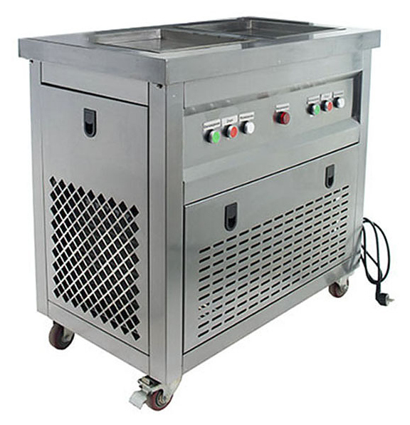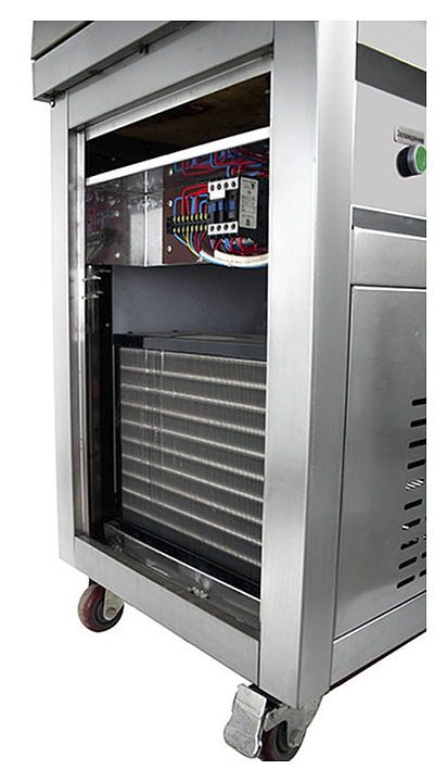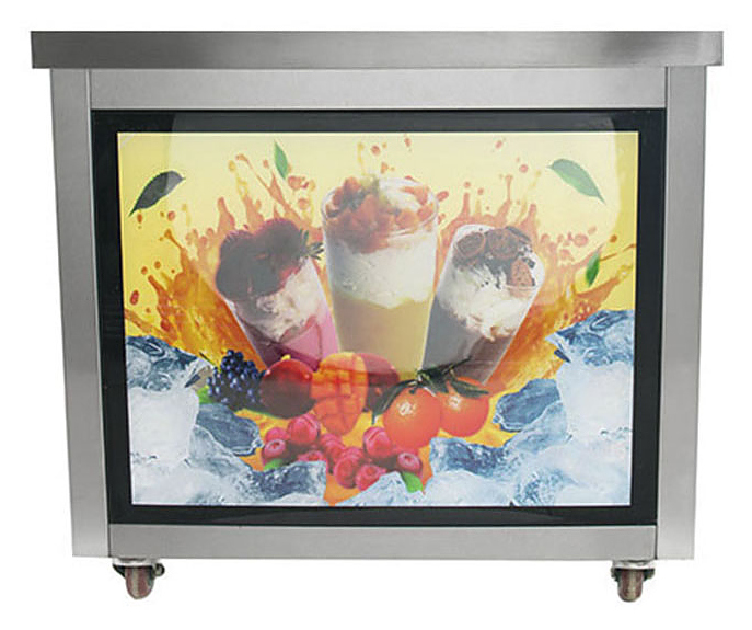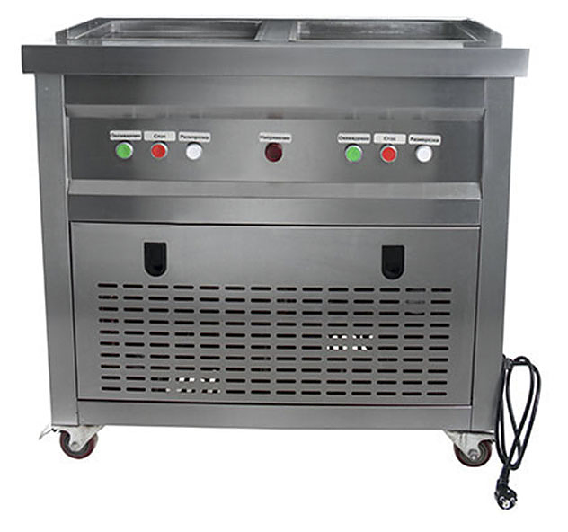 Фризер для мороженого Foodatlas KCB-2F используется на предприятиях общественного питания и торговли для приготовления жареного мороженого в роллах. Модель оснащена механическим управлением, световым коробом, 2 квадратными охлаждаемыми поверхностями для "жарки" десерта при минусовой температуре и 4 колесами, 2 из которых снабжены тормозом. Корпус выполнен из нержавеющей стали 430, сковорода и контейнеры - из нержавеющей стали 304, радиатор - из алюминия, каркас светового короба - из оргстекла, полотно светового короба - из ПВХ. Особенности:
