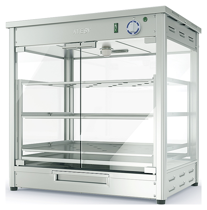 Тепловая витрина ATESY ВК-4 Э используется на предприятиях общественного питания и торговли для кратковременного хранения и демонстрации приготовленных тушек или частей кур, горячих закусок и вторых блюд в горячем виде. Модель оснащена 3 выдвижными перфорированными полками для выкладки продуктов и готовых блюд. Каркас и полки выполнены из пищевой нержавеющей стали AISI 430, корпус - из стекла. Особенности: