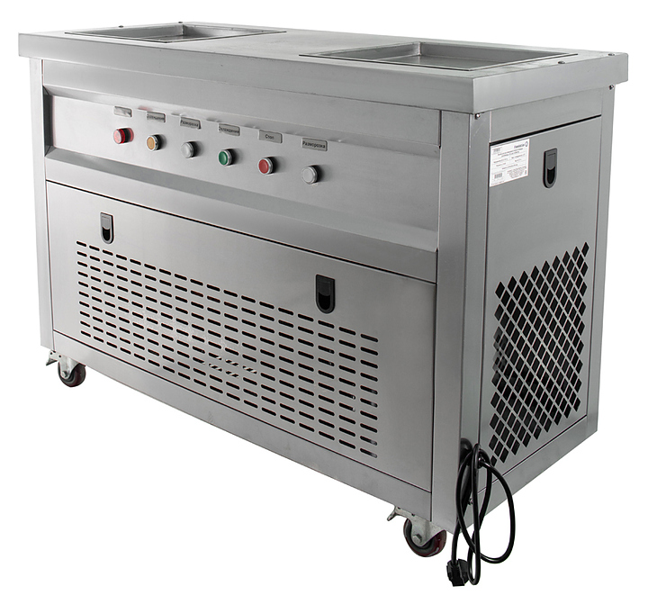 Фризер для мороженого Foodatlas KCB-2F используется на предприятиях общественного питания и торговли для приготовления жареного мороженого в роллах. Модель оснащена механическим управлением, столом для топпингов, 2 квадратными охлаждаемыми поверхностями для "жарки" десерта при минусовой температуре и 4 колесами, 2 из которых снабжены тормозом. Корпус выполнен из нержавеющей стали 430, сковорода - из нержавеющей стали 304, радиатор - из алюминия, каркас светового короба - из оргстекла, полотно светового короба - из ПВХ. Особенности: