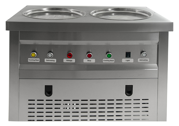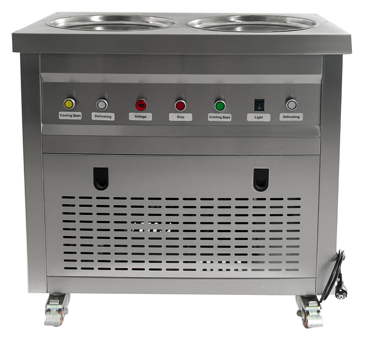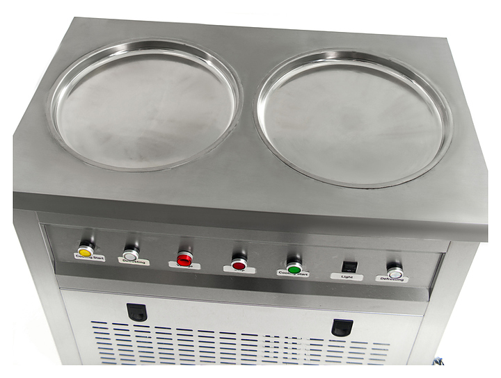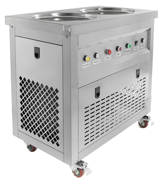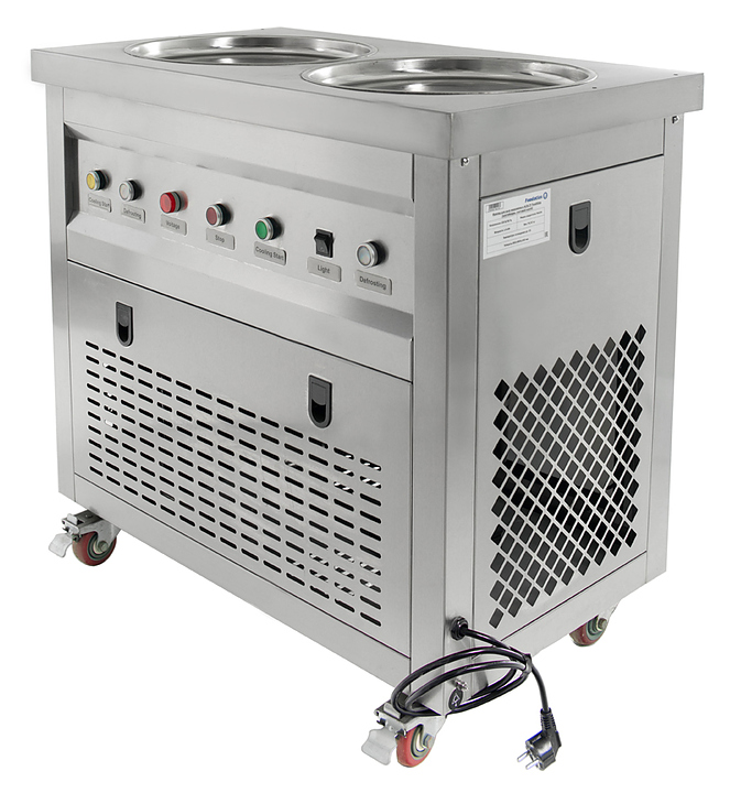 Фризер для мороженого Foodatlas KCB-2Y используется на предприятиях общественного питания и торговли для приготовления жареного мороженого в роллах. Модель оснащена механическим управлением, световым коробом, 2 круглыми охлаждаемыми поверхностями для "жарки" десерта при минусовой температуре и 4 колесами, 2 из которых снабжены тормозом. Корпус выполнен из нержавеющей стали 430, сковорода и контейнеры - из нержавеющей стали 304, радиатор - из алюминия, каркас светового короба - из оргстекла, полотно светового короба - из ПВХ. Особенности: