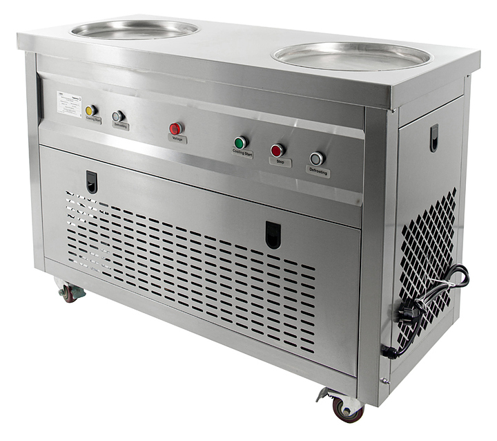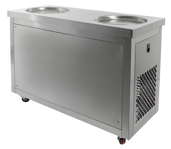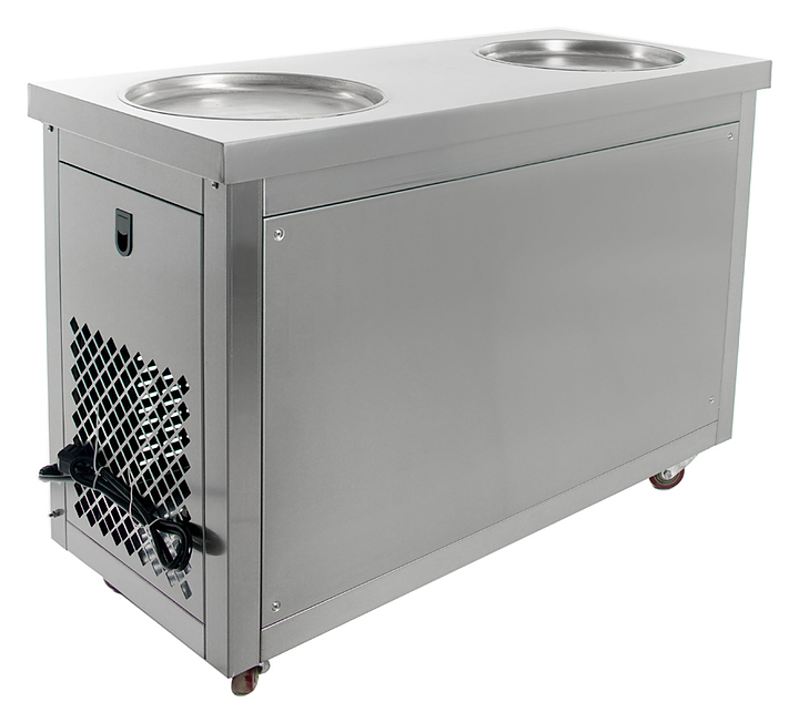 Фризер для мороженого Foodatlas KCB-2Y используется на предприятиях общественного питания и торговли для приготовления жареного мороженого в роллах. Модель оснащена механическим управлением, столом для топпингов, 2 круглыми охлаждаемыми поверхностями для "жарки" десерта при минусовой температуре и 4 колесами, 2 из которых снабжены тормозом. Корпус выполнен из нержавеющей стали 430, сковорода и контейнеры - из нержавеющей стали 304, радиатор - из алюминия. Особенности: