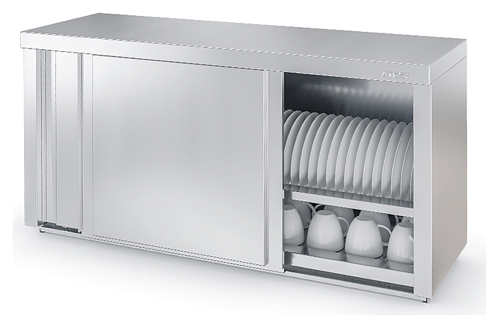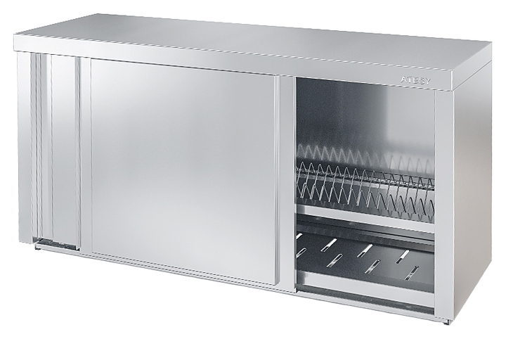 Кухонная полка ATESY ПЗТ-С-1500.420.670-02-К серии Стандарт используется на предприятиях общественного питания и торговли для хранения и сушки в естественных условиях стаканов и стандартных суповых и десертных тарелок различных диаметров. Полка выполнена из нержавеющей стали AISI 430, задняя стенка - из оцинкованной стали толщиной 1,2 мм, двери - из нержавеющей стали, кассета для тарелок - из прутка из нержавеющей стали AISI 304. В комплект поставки входят крепежная планка и метизы для крепления полки к стене. Особенности:
