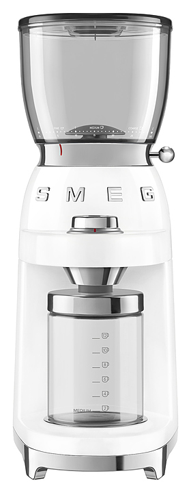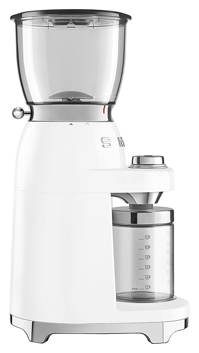 Кофемолка Smeg CGF01WHEU используется в частных домах и квартирах для размола кофейных зерен. Модель выполнена в стиле 50-х годов. Корпус изготовлен из окрашенного металла, конические жернова и магнитный держатель съемного контейнера для молотого кофе - из нержавеющей стали, контейнеры для зерен кофе и молотого кофе - из Tritan™. В комплект поставки входят устройство для центрирования холдера и щётка для чистки. Особенности: