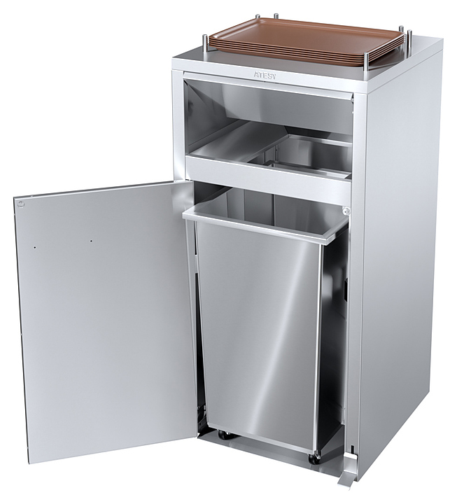 Станция сбора отходов ATESY ССО-120-П-01 используется на предприятиях общественного питания и в ресторанах самообслуживания для сбора пищевых отходов, одноразовой посуды и упаковки от фастфуда, а также для временного хранения использованных подносов. Модель состоит из тумбы и служащей мусороприемником внутренней емкости на колесах, используемой совместно с мешком для мусора. Тумба и емкость выполнены из шлифованной легированной стали. В комплект поставки входят 20 мешков для мусора. Особенности: