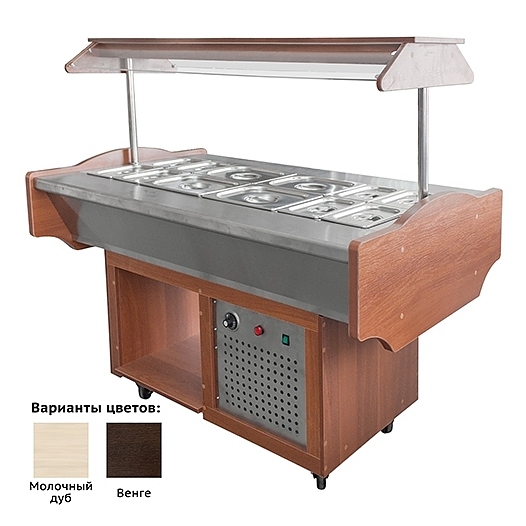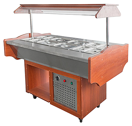 Шведский стол Пищевые Технологии СОЭП-ШС предназначен для кратковременного хранения и демонстрации холодных закусок в составе линий раздач или самостоятельно на предприятиях общественного питания и торговли. Модель оснащена охлаждаемой емкостью и регулируемыми по высоте ножками. Столешница выполнена из нержавеющей стали, обшивка и полка - из ЛДСП. В комплект поставки входят 12 гастроемкостей глубиной 150 мм. Особенности: