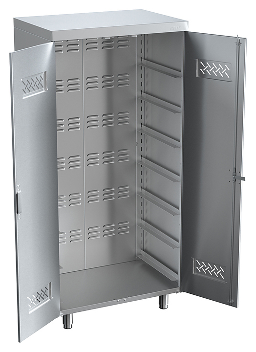 Шкаф ШЗХЛ-С-7-740.450-02-Р серии Стандарт используется на предприятиях общественного питания и торговли для хранения хлеба и хлебобулочных изделий в специальных деревянных или пластиковых лотках. Модель оснащена 7 парами направляющих для размещения лотков. Дно и задняя стенка выполнены из оцинкованной стали, все остальные элементы - из нержавеющей стали AISI 430 толщиной 0,8 мм. Лотки в комплект поставки не входят и приобретаются отдельно. Особенности: