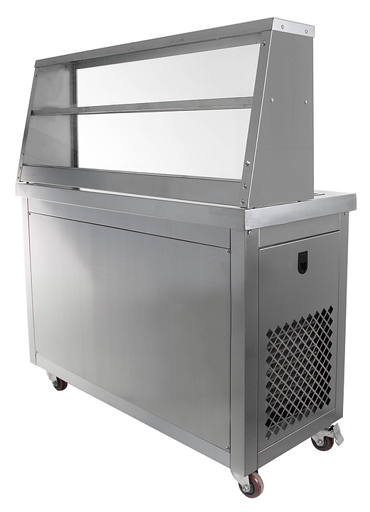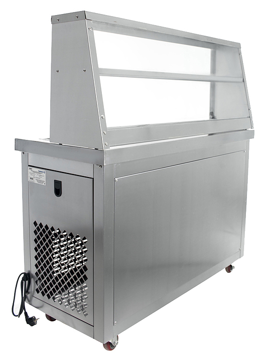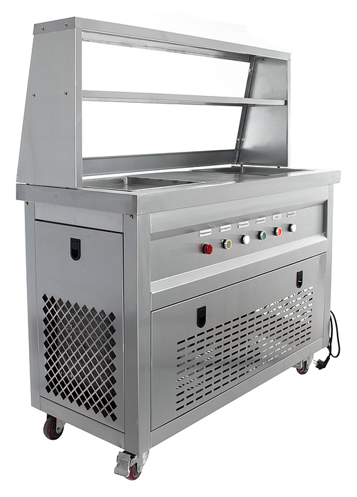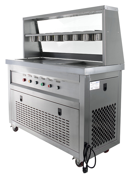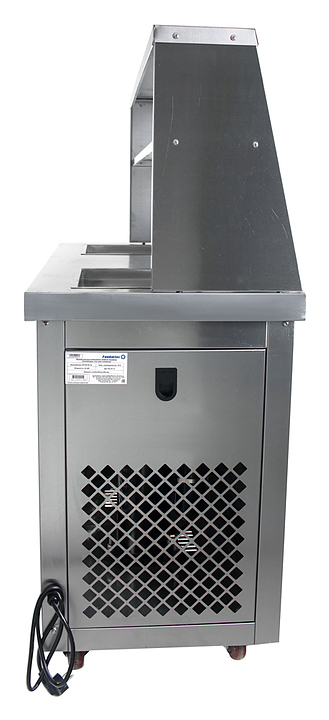 Фризер для мороженого Foodatlas KCB-2F используется на предприятиях общественного питания и торговли для приготовления жареного мороженого в роллах. Модель оснащена механическим управлением, столом для топпингов, 6 квадратными контейнерами, 2 квадратными охлаждаемыми поверхностями для "жарки" десерта при минусовой температуре и 4 колесами, 2 из которых снабжены тормозом. Корпус выполнен из нержавеющей стали 430, сковорода и контейнеры - из нержавеющей стали 304, радиатор - из алюминия, каркас светового короба - из оргстекла, полотно светового короба - из ПВХ. Особенности: