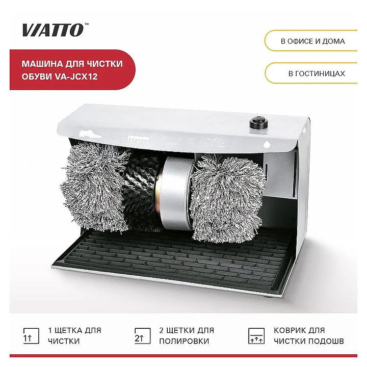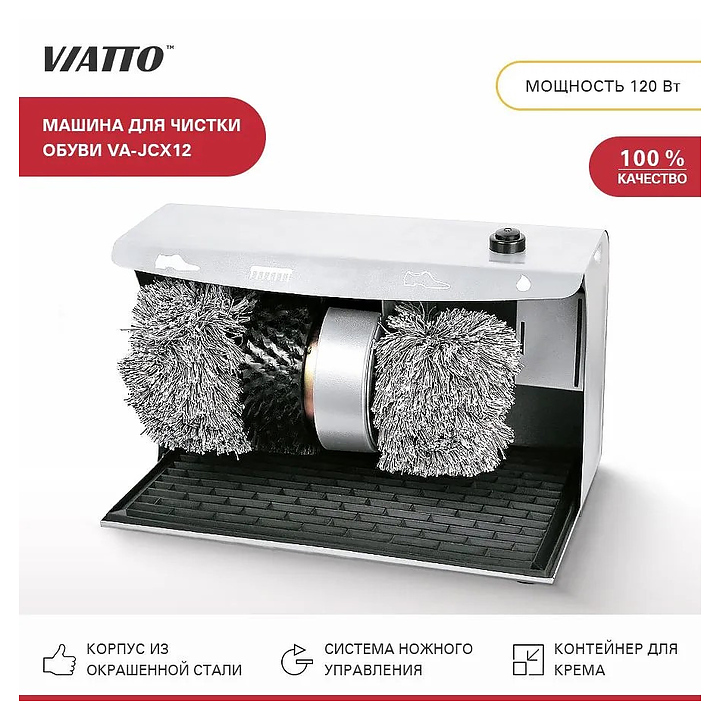 Машинка для чистки обуви VIATTO VA-JCX12 предназначена для чистки и полировки различных видов обуви на предприятиях сферы гостеприимства, в химчистках и прачечных, а также в домашних условиях. Модель оснащена системой ножного управления, щеткой для чистки обуви, 2 щетками для полировки, резиновым ковриком для чистки подошв и контейнером для крема с дозатором. Корпус выполнен из окрашенной стали. Дополнительные характеристики: