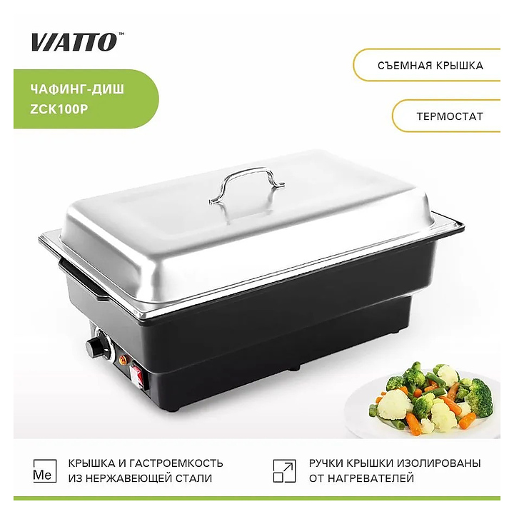 Чафинг-диш VIATTO ZCK100P предназначен для поддержания в горячем состоянии широкого спектра блюд на предприятиях общественного питания и торговли. Корпус выполнен из пластика, съемная крышка и гастроемкость - из нержавеющей стали. Дополнительные характеристики: