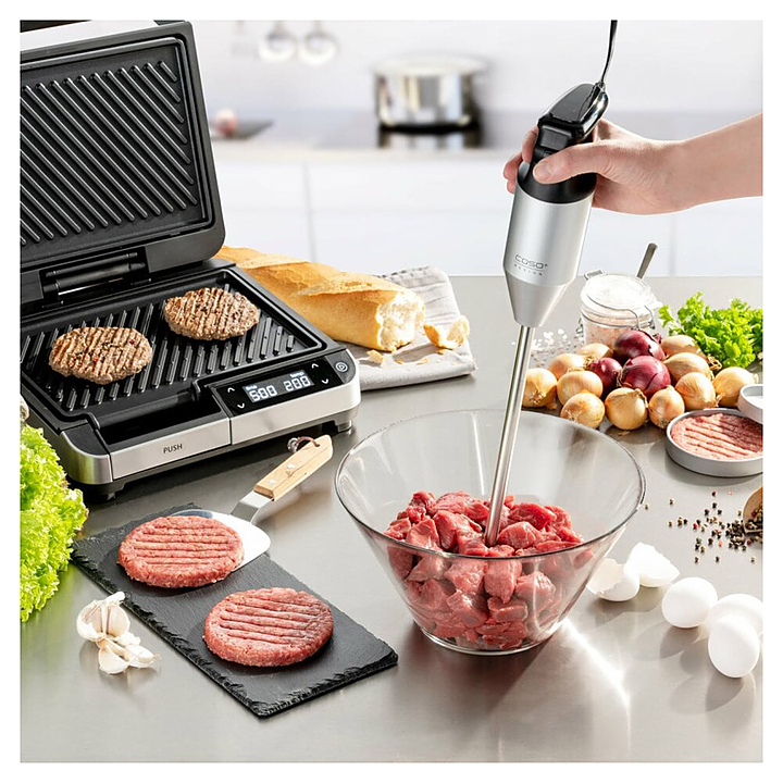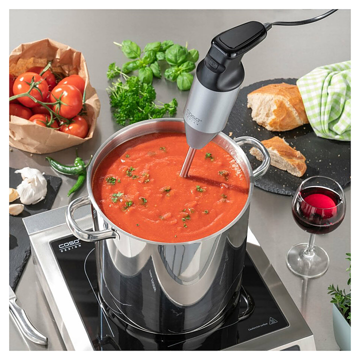 Погружной блендер CASO HB 2400 Pro XL предназначен для приготовления овощных пюре, смузи, зеленых коктейлей, муссов и кремов в частных домах, квартирах, отелях и офисах. Модель оснащена тремя ножами из нержавеющей стали. В комплект поставки входят универсальный измельчитель, диск-венчик, нож для резки мяса и вилка для смены лезвий. Особенности: