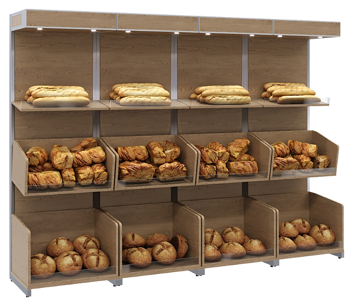 Стеллаж пристенный Carboma S5-20 03 со сплошными деревянными полками предназначен для демонстрации хлеба, батонов и других хлебобулочных изделий в магазинах, супермаркетах, кофейнях, а также на предприятиях общественного питания и торговли. Модель оснащена 3 полками и базовым ящиком. Изделие выполнено из МДФ, плинтуса - из нержавеющей стали, стойки обшиты выкрашенной в серый цвет сталью. Комплектация: