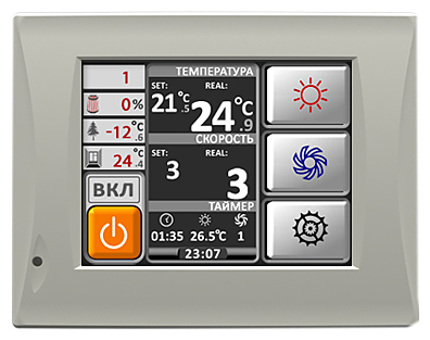 • Функция "Понижение скорости" - в холодное время года скорость вентилятора будет автоматически снижаться до тех пор, пока температура на выходе приточной установки не поднимется до заданной