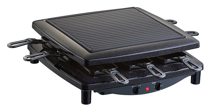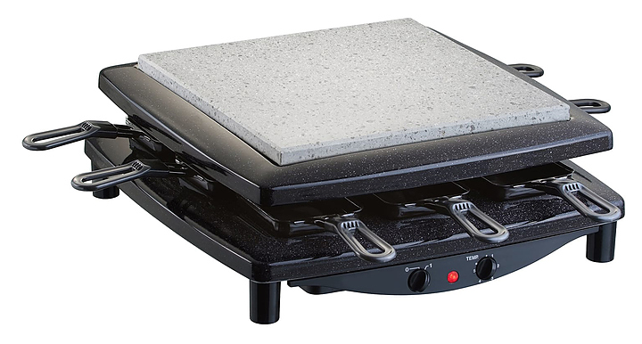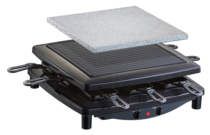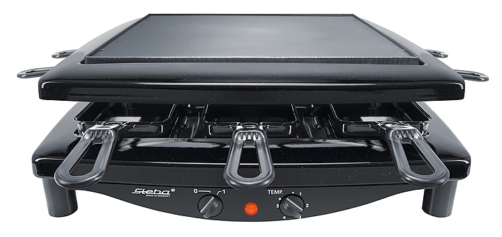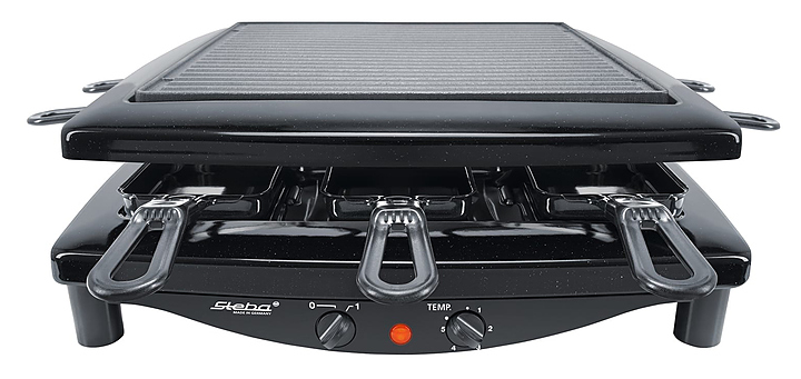 Гриль-раклетница Steba RC 3 plus предназначен для жарки мяса, рыбы и овощей с одновременным плавлением сыра в частных домах, квартирах, отелях и офисах. Модель оснащена панелью управления с поворотными регуляторами, светодиодным индикатором работы и съемными пластинами для гриля. В комплект поставки входят 8 порционных сковородок, пластина для гриля из натурального камня и двусторонняя пластина из эмалированного чугуна рифленая / гладкая. Особенности: