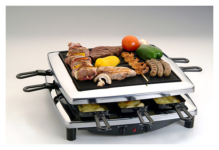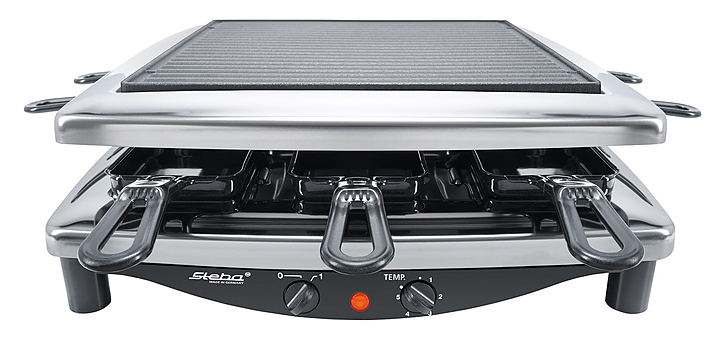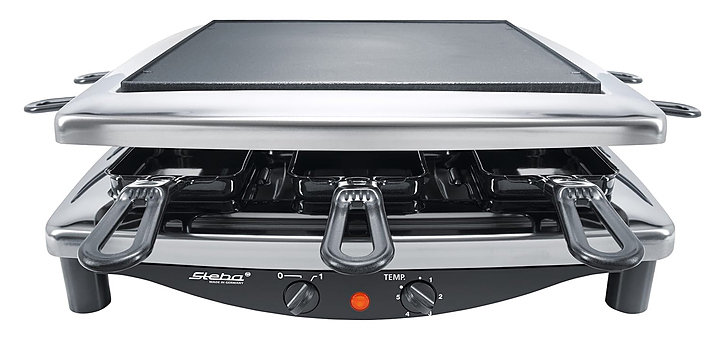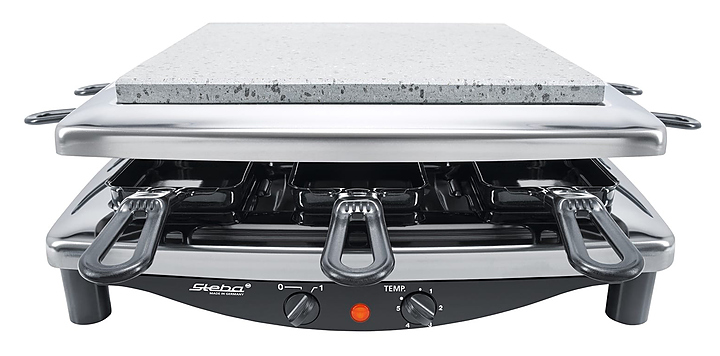 Гриль-раклетница Steba RC 3 plus chrom предназначен для жарки мяса, рыбы и овощей с одновременным плавлением сыра в частных домах, квартирах, отелях и офисах. Модель оснащена панелью управления с поворотными регуляторами, светодиодным индикатором работы и съемными пластинами для гриля. Корпус выполнен из нержавеющей стали. В комплект поставки входят 8 порционных сковородок, пластина для гриля из натурального камня и двусторонняя пластина из эмалированного чугуна рифленая / гладкая. Особенности: