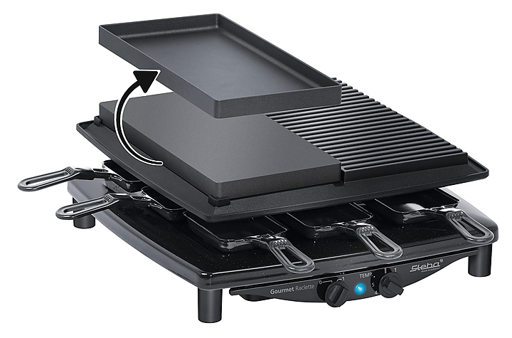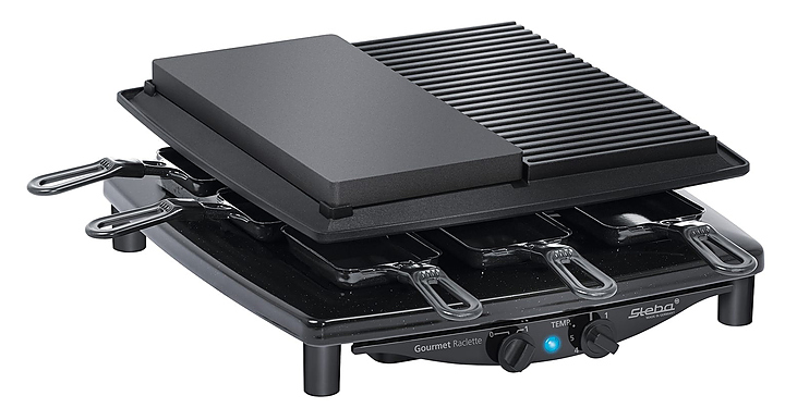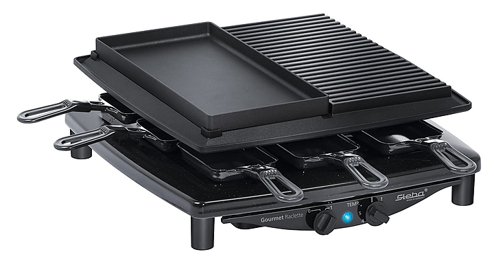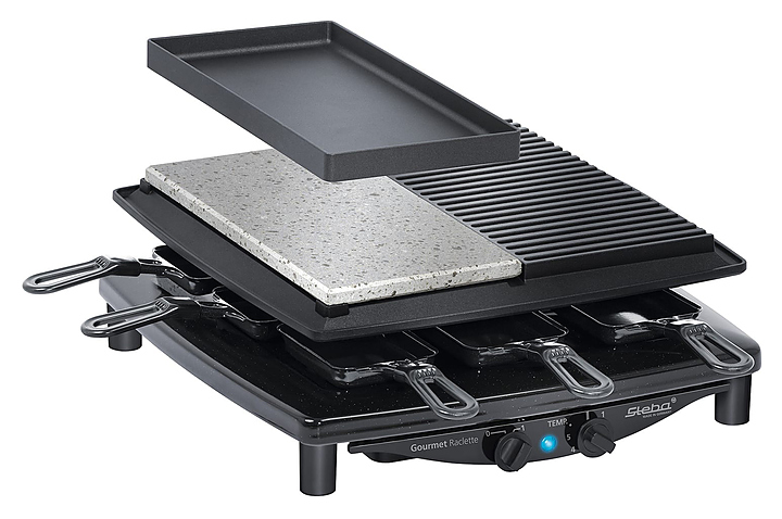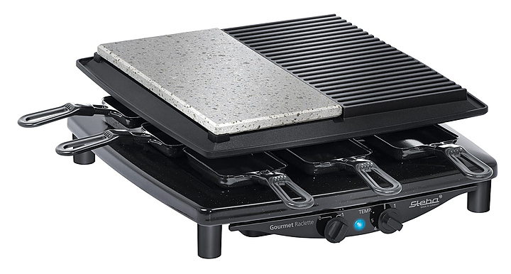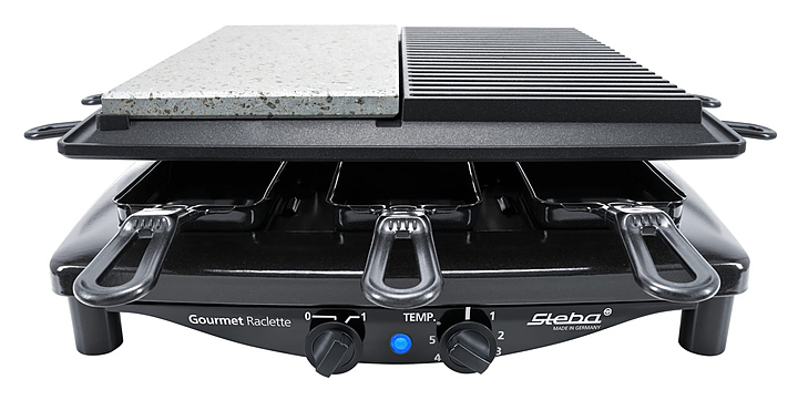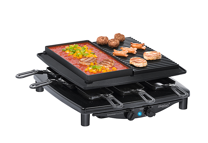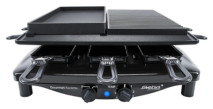 Гриль-раклетница Steba RC 4 plus DELUX предназначен для жарки мяса, рыбы и овощей с одновременным плавлением сыра в частных домах, квартирах, отелях и офисах. Модель оснащена панелью управления с поворотными регуляторами, светодиодным индикатором работы, съемными пластинами для гриля и лотком для стока жира. В комплект поставки входят 8 порционных сковородок, пластина для гриля из натурального камня, литая пластина с антипригарным покрытием и поддон для приготовления соусов. Особенности: