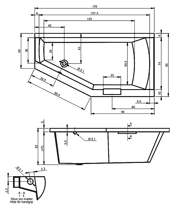 Акриловая правосторонняя ванна RIHO GETA RIGHT 170x90 см сблагодаря оригинальному дизайну идеально дополнит интерьер ванной комнаты. Ассиметричная угловая форма позволяет с комфортом расположиться в ванне. Модель оснащена широкой боковой поверхностью, на которой можно располагать банные принадлежности и средства для душа. Изделие выполнено из акрила, который мгновенно прогревается,  обладает небольшим весом и высокими шумоизоляционными характеристиками, а также устойчив к механическим повреждениям, армированного стекловолокном с примесью полиэстра, дно усилено прочной ламинированной ДСП для большей прочности.