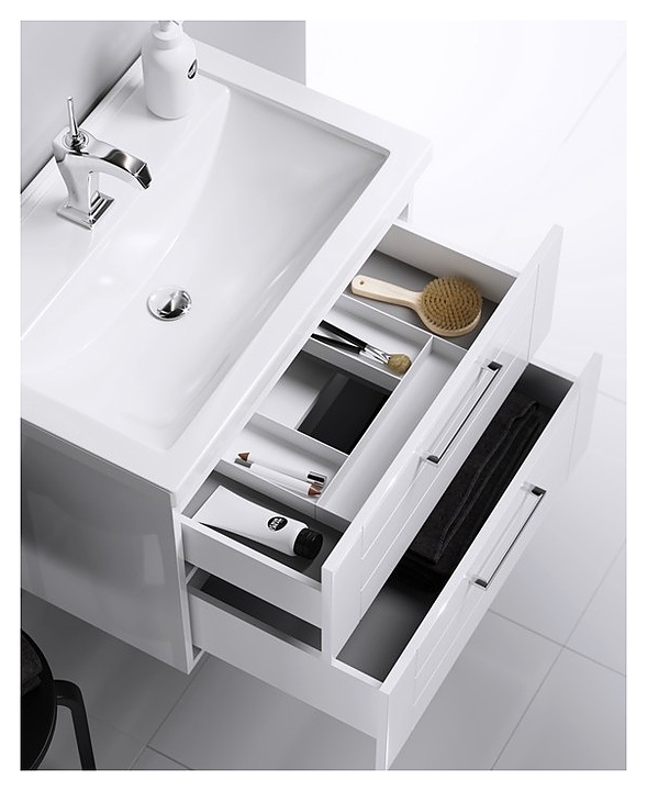 Тумба Aqwella Manchester MAN01082 с легкостью впишется в интерьер любой ванной комнаты. Подвесная конструкция и отсутствие ножек создают иллюзию парения в воздухе и упрощают уборку. Ящики тумб оснащены скрытыми направляющими с системой мягкого закрывания, а на металлической хромированной ручке выполнена гравировка с логотипом Aqwella. Особенностью данной модели является система организации внутреннего пространства: в верхнем ящике установлен пластиковый лоточек с 3 отсеками для хранения. Фасады мебели производятся из МДФ и покрыты 5-ю слоями белой глянцевой эмали. Боковины из ЛДСП также окрашены. Тумба используется вместе с раковиной Фостер 800. Для установки понадобится набор крепежей для монтажа на стену. Дополнительные характеристики:
