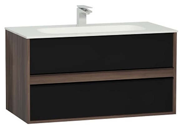Тумба с раковиной Vitra Metropole 58183 лаконичных форм элегантно впишется в интерьер Вашего дома. Благодаря подвесной конструкции модель не занимает много места, что экономит пространство в ванной комнате и облегчает уборку. Система хранения состоит из двух выдвижных ящиков. Корпус изделия выполнен из МДФ и покрыт термоформовочной пленкой, фасад изготовлен из чёрного акрилового стекла. В комплект поставки входит раковина Infinit M58000018002, донный клапан и сифон белого цвета. Особенности: