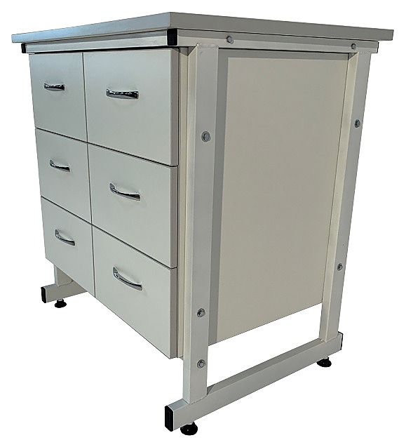 Лабораторная стол-тумба Мед Мебель MED 18.003 с РУ предназначена для хранения различных предметов и оптимизации рабочего места сотрудников в лабораториях и медучреждениях. Модель оснащена выдвижными ящиками и регулируемыми по высоте ножками. Обшивка и столешница выполнены из ЛДСП, каркас - из стального профиля. Тумба поставляется с регистрационным удостоверением. Особенности: