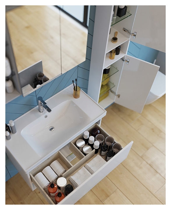 Тумба Dreja Perfecto 99.0807 в современном стиле дополнит интерьер любой ванной комнаты. Подвесная конструкция и отсутствие ножек создают иллюзию парения в воздухе и упрощают уборку. Отличительной особенностью данной тумбы является открытая полочка для удобного хранения отдельных предметов. Корпус выполнен из ЛДСП, которая характеризуется стойкостью к небольшим механическим повреждениям и простотой в уходе. Фасады изготовлены из высококачественной МДФ, которая обеспечивает изделию привлекательный внешний вид, а также износостойкость и долговечность. Тумба используется вместе с раковиной Grace 70. В комплект поставки входят навесные крепления. Шурупы (крючки) с дюбелями в комплект поставки не входят и приобретаются отдельно. Особенности: