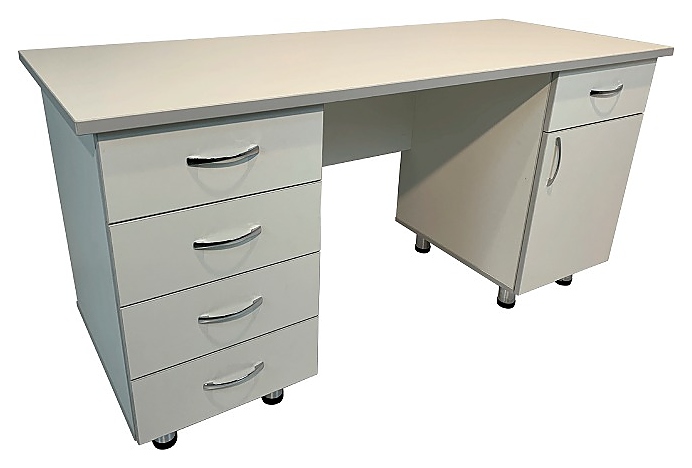 Медицинский стол Мед Мебель MD СМ 10.09 с РУ предназначен для организации рабочего места сотрудников медучреждений. Модель оснащена регулируемыми по высоте опорами для компенсации неровностей напольного покрытия и 2 боковыми тумбами: тумба справа - с дверцей и выдвижным ящиком, тумба слева - с 4 выдвижными ящиками. Каркас обеспечивает жесткость, устойчивость и прочность конструкции. Столешница и каркас выполнены из ЛДСП.
