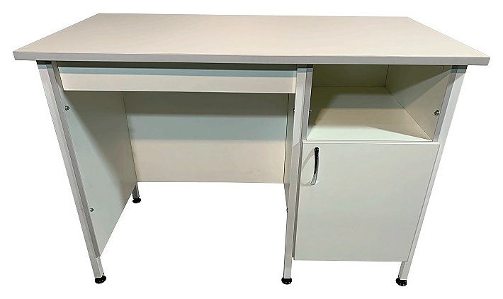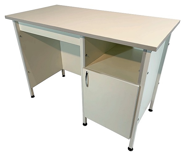 Стол лабораторный Мед Мебель СЛ 12.011 с РУ предназначен для организации рабочего места сотрудника медицинской лаборатории. Модель оснащена тумбой с нишей и дверцей, перемычкой, придающей изделию дополнительную прочность, и регулируемыми по высоте ножками за счет винтовых опор-регуляторов. Каркас обеспечивает жесткость, устойчивость и прочность конструкции. Обшивка стола и столешница выполнены из ЛДСП, каркас - из стального профиля, покрытого порошковой краской.