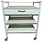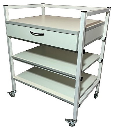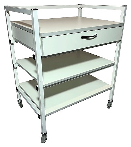 Мобильный лабораторный стол Мед Мебель СЛм 17.001 с РУ предназначен для временного размещения необходимых инструментов, приборов и предметов, используемых в медицинских лабораториях для проведения исследований. Каркас обеспечивает легкость и прочность конструкции. Модель оснащена выдвижным ящиком под столешницей и 4 колесными опорами с тормозом, благодаря которым столик можно свободно перемещать по комнате. Столешница, ящик и полки выполнены из ЛДСП, каркас - из стального профиля, покрытого порошковой краской. Стол поставляется с регистрационным удостоверением. Дополнительные характеристики: