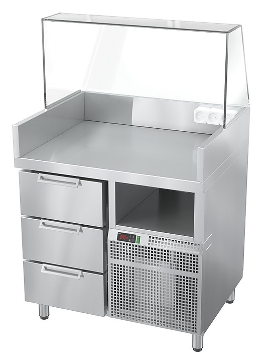 Станция ATESY Бавария БХС - 900.700-02 предназначена для комплексного оснащения рабочего места приготовления и продажи хот-догов и бургеров, а также для хранения предварительно охлажденных мясных полуфабрикатов, хлебобулочных изделий, начинок и соусов на предприятиях общественного питания и торговли. Модель оснащена встроенным контроллером управления температурным режимом станции с возможностью программирования и нейтральной нишей для хранения инвентаря: щипцов, салфеток, одноразовой посуды. Все конструктивные элементы станции, контактирующие с продуктами питания, выполнены из нержавеющей стали. Особенности: