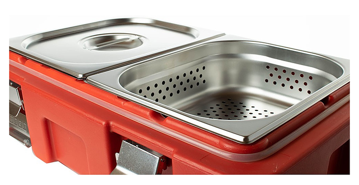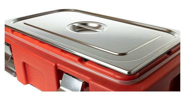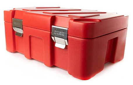 Термоконтейнер Foodatlas CB2 (24L, красный) предназначен для перемещения горячих и холодных готовых блюд и напитков в разогретом и охлажденном виде в течение нескольких часов. Модель оснащена герметичной крышкой с замком-защелкой. Цельнолитый двухслойный корпус выполнен из полиэтилена с инжекцией пенополиуретана высокой плотности, замок - из стали 304. Дополнительные характеристики:
