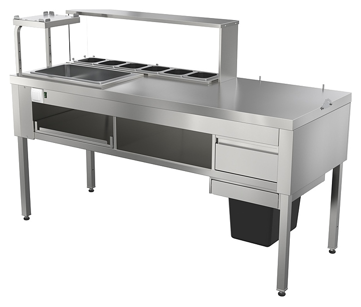 Шаурма-станция ATESY Восточный базар ШС-1800.700-02 предназначена для комплексного оснащения рабочего места приготовления и продажи шаурмы, а также для хранения предварительно охлажденных мясных полуфабрикатов, хлебобулочных изделий, начинок и соусов на предприятиях общественного питания и торговли. Станция представляет собой стол выполненный на сборно-сварном каркасе, на рабочей столешнице которого смонтированы холдеры для установки гастроемкостей с ингредиентами для шаурмы. Все конструктивные элементы станции, контактирующие с продуктами питания, выполнены из пищевой нержавеющей стали. Со стороны покупателя емкости защищены закаленным стеклом. Установка и контактный гриль в комплект поставки не входят и приобретаются отдельно. Особенности: