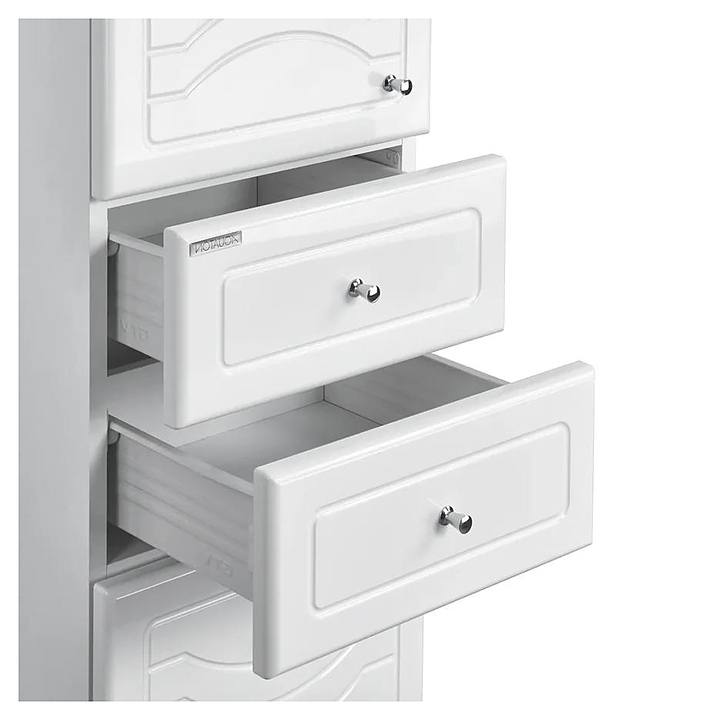 Напольный пенал AQUATON Домус 1A122003DO01R выполнен в современном стиле, декорирован фрезеровкой с плавными симметричными линиями и благодаря лаконичному дизайну отлично дополнит интерьер любой ванной комнаты. Напольная конструкция обеспечивает легкий монтаж и не требует специального ремонта в помещении. Модель оснащена одной дверью, за которой находятся две стеклянные полки, регулируемые по высоте, двумя небольшими ящиками и откидным ящиком с корзиной для белья в нижней части пенала. Изделие выполнено из влагостойкой ламинированной плиты и высококачественной МДФ, окрашено в белый цвет с высокой степенью глянца полиэфирной краской ультрафиолетового отверждения, которая обеспечивает изделию привлекательный внешний вид, а также износостойкость и долговечность. Комплектация: