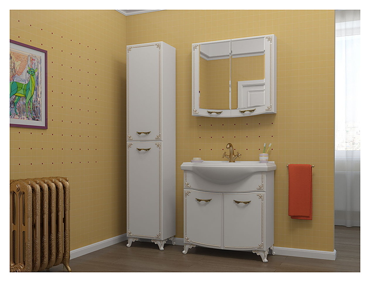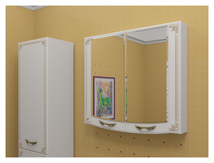 Зеркальный шкаф КАКСА-А Классик-Д 65 003969 отлично сочетает в себе утонченность классического стиля, золотой декор ручной работы и современные элементы. Позволит создать в ванной комнате по-настоящему королевскую атмосферу. Благодаря подвесной конструкции модель не занимает много места, что позволяет экономить пространство в небольшой ванной комнате, а также облегчает уборку. Модель оснащена двумя зеркальными дверками и полочками для хранения. Корпус выполнен из влагостойкой ЛДСП в белом матовом цвете, фасады изготовлены из окрашенной и покрытой лаком МДФ, а также украшены накладным декором, патинированным под золото. Для установки понадобится набор крепежей для монтажа на стену. Особенности: