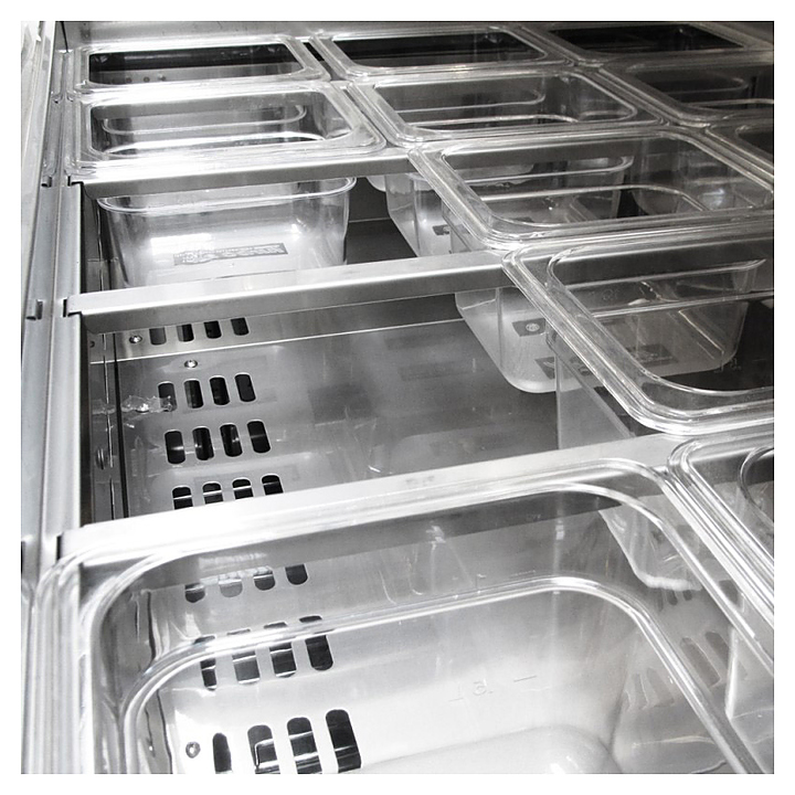 Стол для сбора сэндвичей Turbo air CMST-36-15 предназначен для кратковременного хранения и нарезки ингридиентов для бургеров и для сборки готовых продуктов на предприятиях общественного питания и торговли. Модель оснащена 1 полкой и 4 фронтальными колесами со стопорами. Корпус выполнен из нержавеющей стали (гальванизированная сталь на оборотной стороне и внизу) с применением пожаробезопасных стенок толщиной 60 мм, уплотнения - из АБС-пластика, который улучшает теплоизоляцию и не пропускает конденсат, пол - из нержавеющей стали с алюминиевыми вставками по бокам и сзади оборудования, регулируемые полки - из толстой стальной проволоки с виниловым покрытием, двери собственной конструкции оснащены петлями из высококачественной нержавеющей стали, разделочная доска - из пищевого полиэтилена низкой плотности высокого давления. В комплект поставки входят 15 фирменных гастроемкостей GN 1/6 глубиной 150 мм. Особенности: