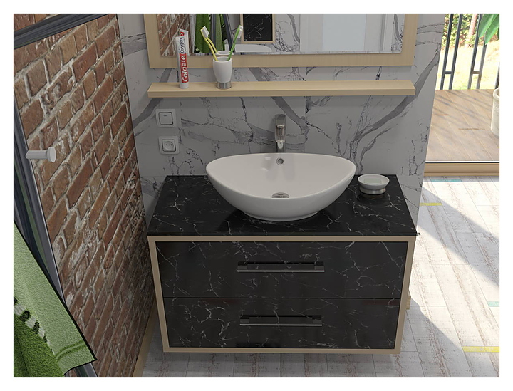 Тумба КАКСА-А Бруклин 004591 выполнена в модном, современном стиле. Чёрный мрамор и дерево молочного оттенка, идеальное решение для брутальной и стильной ванной комнаты. Имеет подвесную конструкцию и не занимает много места, что позволяет экономить пространство, а также облегчает уборку. Модель оснащена двумя ящиками на направляющих скрытого монтажа с доводчиками, верхний ящик с вырезом под сифон. Корпус выполнен из влагостойкой ЛДСП с древесной текстурой, фасады изготовлены из эксклюзивных антибактериальных, высокоглянцевых МДФ плит LUXE. Тумба используется вместе с накладной раковиной KIROVIT Гамма 560, которая в комплект поставки не входит и приобретается отдельно. Столешница КАКСА-А Бруклин 004593 в комплект поставки не входит и приобретается отдельно. Особенности: