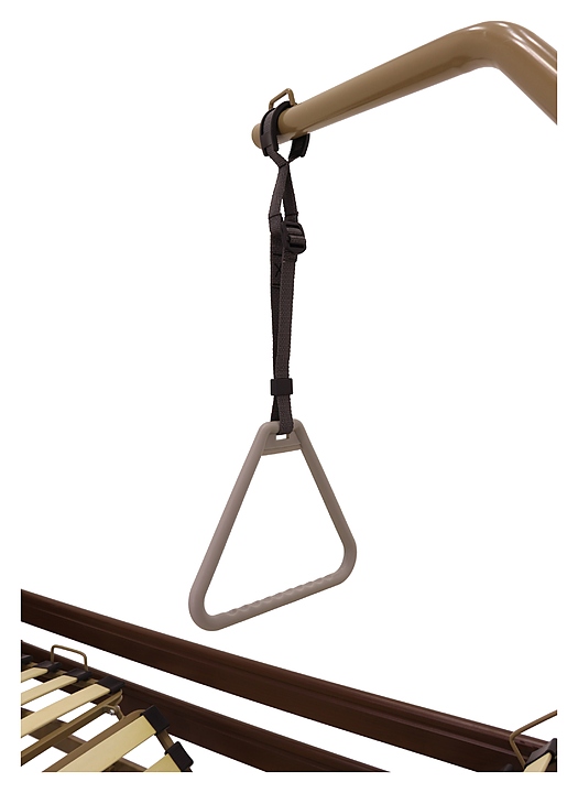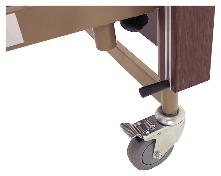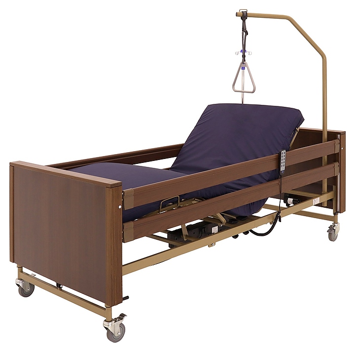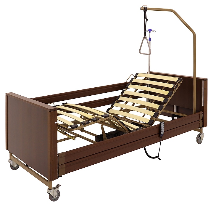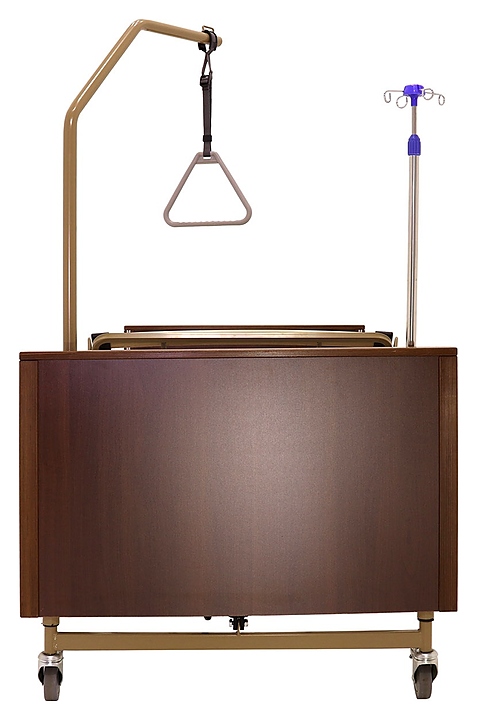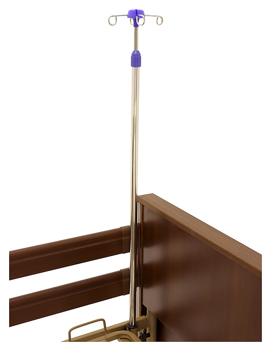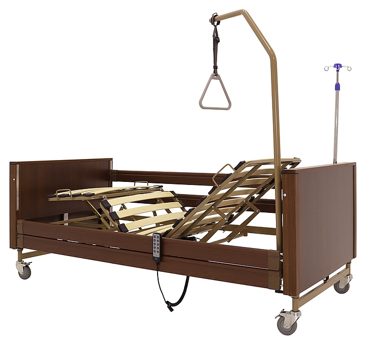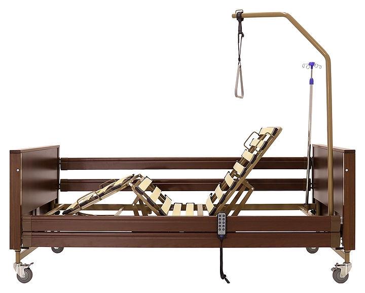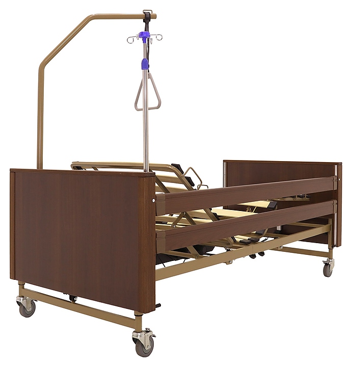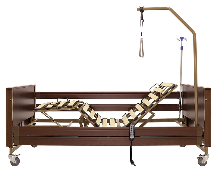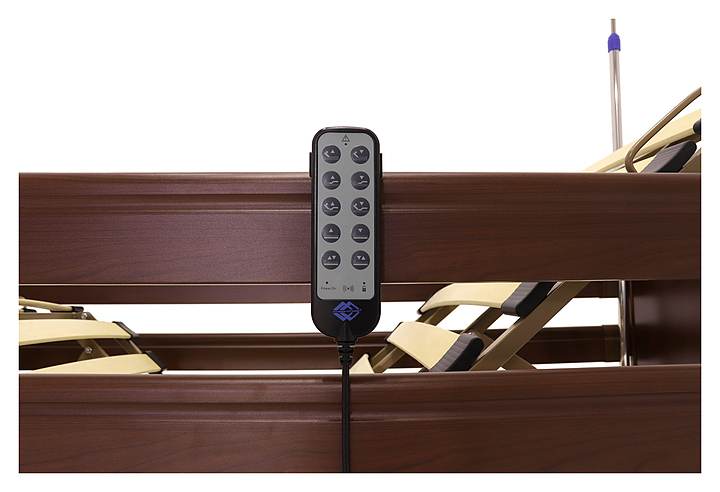 Медицинская кровать электрическая Med-Mos YG-1 (КЕ-4024М-11) коричневая с РУ используется в учреждениях здравоохранения для более комфортного пребывания в больнице лежачих больных с проблемами опорно-двигательного аппарата и пациентов, которые проходят процесс реабилитации после перенесенных операций или тяжелых заболеваний. Модель оснащена пластиковыми торцевыми элементами на боковых ограждениях, индикатором режима работы и индикатором заблокированного/разблокированного состояния на пульте управления пациента. Ложе и каркас выполнены из сварных конструкций из профильных труб из высокопрочной стали, покрытых ударопрочной эпоксидной эмалью, поперечины - из высокопрочных деревянных ламелей, торцевые спинки - из стального каркаса с облицовкой из массива бука, боковые ограждения - из алюминиевого профиля, покрытого декоративной пленкой под дерево, колеса - из полиуретана, дуга для подтягивания и инфузионная стойка - из нержавеющей стали с элементами из пластика. Кровать поставляется с регистрационным удостоверением Минздрава РФ. Комплектация: